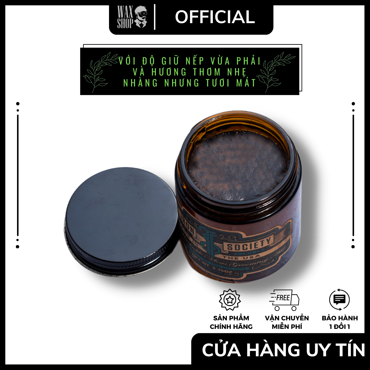 - The Iron Society Water Soluble Pomade với độ giữ nếp vừa phải và hương thơm tươi mát đậm đà, loại pomade này giữ nếp rất tốt và tốt nhất cho tóc ẩm phù hợp với hầu hết mọi kiểu tóc đặc biệt là tóc xoăn hay lượn sóng.